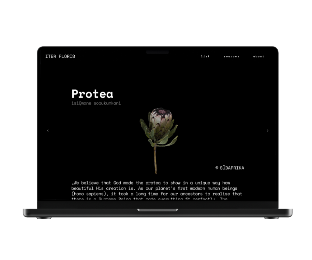 The Digital Flower Bouquet project employs a multi-stage technical process that integrates digital capture, 3D-modeling, and web-based presentation. As a preparation, we have visited a wholesale market for flowers to gain a broad overview of specimens, where they come from, and how they are distributed. After choosing the flowers, we captured them with Polycam, a 3D photogrammetry software. The 3D models are refined, optimized, and prepared for web presentation using Blender. After that, the 3D models are integrated into a website that serves as both an archive and an educational platform. The website presents each flower alongside its indigenous names, cultural histories, medicinal uses, and colonial contexts.